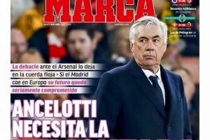 西班牙媒体《马卡报》最新一期的封面人物为安切洛蒂,媒体指出,这位皇马主帅需要带队逆转,如果本赛季欧冠出局,他的帅位将面临严重危机。