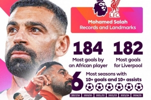 体育资讯4月11日讯 利物浦宣布与萨拉赫续约,英超官方晒出数据图片,展示萨拉赫在英超的纪录。
