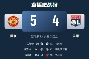 体育资讯4月18日讯 欧联杯1/4决赛次回合,曼联在加时赛完成让二追三,最终曼联主场5-4击败里昂,以7-6的总比分晋级欧联杯四强。