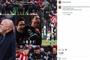利物浦老板娘琳达更新了社媒,庆祝胜利:“努涅斯最后时刻的梅开二度让我们7分领跑,本赛季到目前为止英超净胜球30个!”