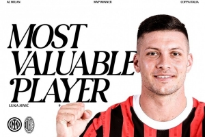 米兰官方社媒晒出海报,宣布约维奇当选德比战米兰队内最佳球员。