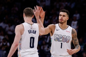 上半场,掘金两大首发波特和布劳恩表现糟糕,其中波特4中0全部来自外线,罚球2中2,拿到2分2篮板的数据;布劳恩4中0,三分球3中0,没有得分入账,仅拿到1篮板1盖帽的数据,正负值-36全场最低。