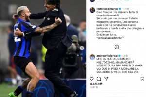 在小因扎吉的离任官宣后,国米后卫迪马尔科在社媒与小因扎吉告别,他晒出了多张两人相拥庆祝胜利的照片,并配文写道:
