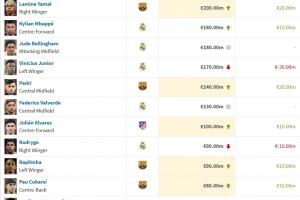 体育资讯06月09日讯 德转更新西甲联赛身价,亚马尔2亿欧元成为世界第一,姆巴佩上涨1000万升至1.8亿欧元,维尼修斯下降3000万降至1.7亿欧元。