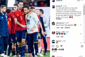 体育资讯9月27日讯 布斯克茨将在本赛季结束后退役,他在西班牙国家队的队友科克社媒发文致敬。