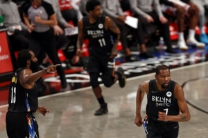 布鲁克林篮网队:在2020-21赛季,当杜兰特和欧文健康回归后,篮网队通过交易得到了詹姆斯-哈登,组成了一个进攻火力强大的三巨头。然而,由于伤病问题,他们在常规赛中只一起打了8场比赛。