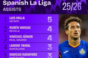 体育资讯10月7日讯 日前,Squawka统计了本赛季西甲助攻榜,维尼修斯并列第2,亚马尔、拉什福德、居勒尔并列第4。