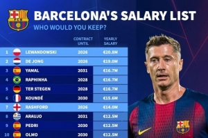 德转列巴萨年薪榜:莱万2080万欧居首,德容1900万欧次席