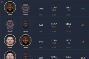 媒体人Jacob分享了一组詹姆斯和东契奇上赛季同场与否的净效率对比。