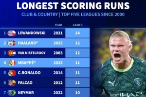 新世纪五大联赛球员最长连续进球榜:莱万14场 哈兰德范尼均12场