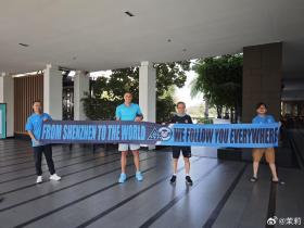 记者程文莉发布了球迷与抵达泰国曼谷的深圳新鹏城球员的合影,称来自深圳南看台的谢会长等球迷带着欢迎横幅前往接机。