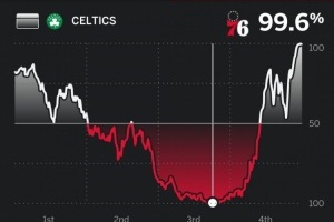 比赛第三节还剩2分56秒时,76人一度领先26分。ESPN数据预测显示,76人当时赢球概率高达99.6%。