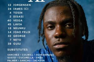 切尔西vs莫克姆首发:12-约根森、24-里斯-詹姆斯、4-阿达拉比奥尤、2-迪萨西、40-维加、45-拉维亚、18-恩昆库、14-菲利克斯、32-乔治、7-内托、38-吉乌