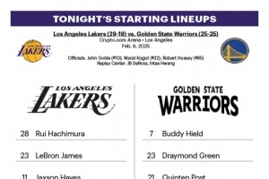 体育资讯2月7日讯 今天中午11点,湖人将主场对阵勇士。赛前,双方公布了首发阵容。