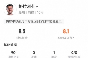 体育资讯2月8日讯 曼城在本轮足总杯2-1逆转莱顿东方,格拉利什本场数据如下: