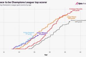 姆巴佩(紫)、哈兰德(蓝)在欧冠的进球效率,与C罗(红)、梅西(黄)、莱万(灰)三大射手的对比