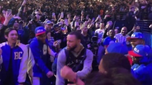 在训练前出场阶段,杜兰特和库里先后被介绍出场,KD挥拳向全场观众示意,库里则在自己的主场大秀舞技。