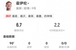 体育资讯2月17日讯 曼联在本轮英超0-1不敌热刺,首发中锋霍伊伦本场数据如下: