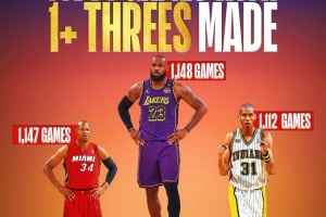 据统计,本场比赛过后,詹姆斯生涯至今已经有1148场比赛至少命中1记三分,超越雷-阿伦(1147)独霸历史第一,雷吉-米勒(1112场)排名历史第三。