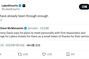 浓眉称想和消防员会面,并赠送湖人比赛的门票,湖媒调侃:放过他们吧,他们已经经历太多了(湖人近期遭遇3连败)。