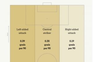 体育资讯3月1日讯 TA统计了罗德里戈在攻击区域左路、中路和右路的进球效率区别,他在左路最高效。