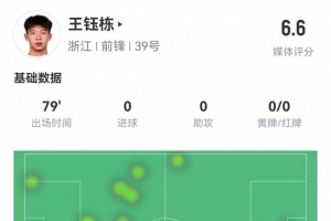 体育资讯3月1日讯 正在进行的中超第二轮,云南玉昆主场暂1-1浙江队。此役浙江队国青小将王钰栋首发登场79分钟被换下,球员全场重点数据如下↓