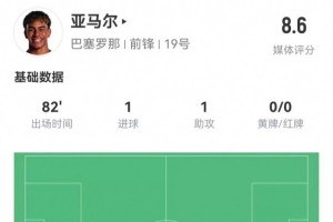 体育资讯3月12日讯 巴萨在本轮欧冠3-1击败本菲卡,亚马尔本场数据如下:
