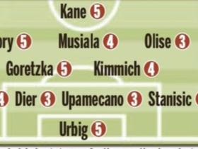 前场:格纳布里 5分、穆西亚拉 4分、奥利塞 3分、凯恩 5分