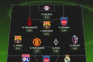 中场:亚马尔(巴萨,8.95分)、B费(曼联,9.37分)、普莱亚(门兴,9.30分)、恩多耶(博洛尼亚,9.09分)