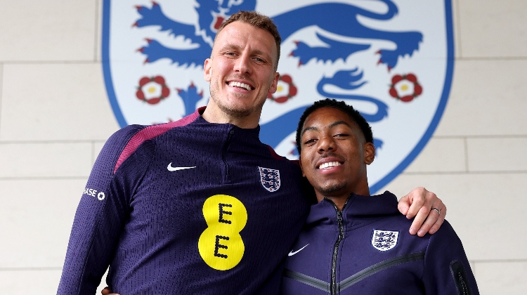 32岁的丹-伯恩与18岁的斯凯利首次入选英格兰队,工作人员为两人拍摄合照,丹-伯恩2米01、斯凯利1米78,两人的“最萌身高差”被狠狠调侃。