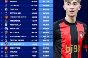 13、伯恩茅斯 4.36亿欧(+6800万欧)