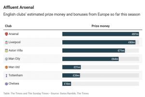 体育资讯03月19日讯 泰晤士报统计了截至目前英超球队在欧战的预估收入和奖金。阿森纳居首,利物浦次之,具体排名如下: