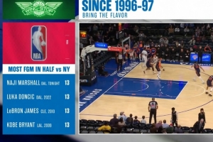 据统计,自1996-97赛季(有统计)以来,马绍尔在对阵尼克斯的半场进了13球,追平了科比、詹姆斯和东契奇,并列第一。